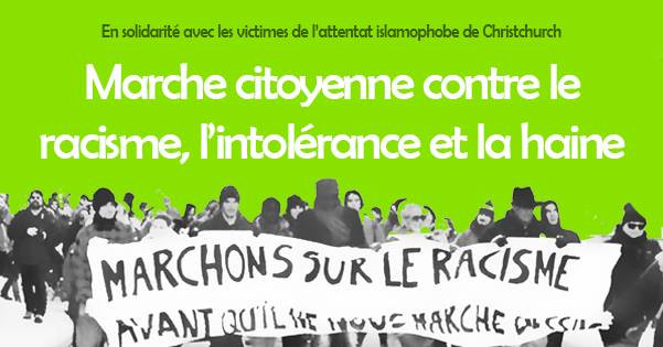 La marche du 23 mars sera l’occasion d’exprimer notre solidarité avec les victimes de la tuerie de Christchurch. La haine sous toutes ses formes, (racisme, islamophobie, antisémitisme, etc.) ne doit jamais être prise à la légère, car elle est le terreau où germent les massacres. Soyons plus que jamais uni-e-s et solidaires pour dénoncer le racisme, l’intolérance, la haine et l’islamophobie.